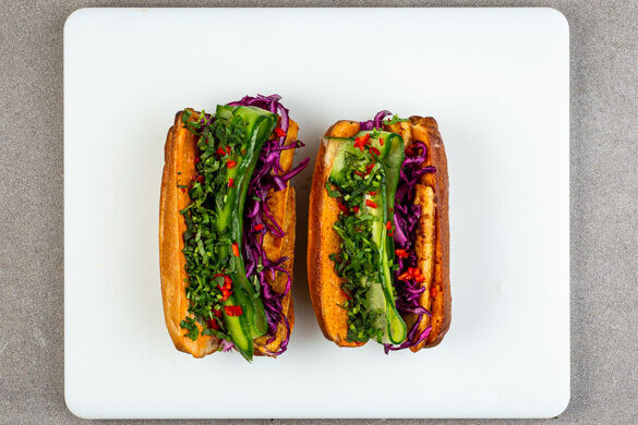 Der vietnamesische Klassiker Bánh mì beglückt uns heute in einer vegetarischen Variante mit knusprigem Tofu und einem knackigen Rotkohlsalat. Der Tofu badet vor dem Braten in einer Mischung aus Sojasauce und geriebenem Ingwer. Das cremige Dressing mit Sriracha-Sauce sowie frische Kräuter und Peperoni sorgen für zusätzliche Aromenpower. Dazu gibt es gebackene Karotten aus dem Ofen.
