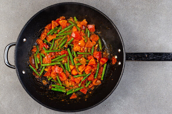 Die Tomaten und die Bohnen in einer mittelgroßen Pfanne mit 2EL Olivenöl bei mittlerer bis starker Hitze 7–9Min. braten, dabei die Tomaten mit einem Kochlöffel leicht zerdrücken. Den Knoblauch schälen und fein würfeln, unter das Gemüse rühren und weitere ca. 2Min. mitbraten.