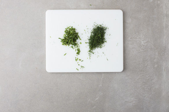 Die Minzeblätter von den Stängeln zupfen und fein schneiden. Den Dill samt Stängeln ebenfalls fein schneiden.