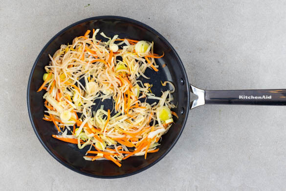 In einem großen Topf ausreichend gesalzenes Wasser für die Nudeln zum Kochen bringen. 6EL Wasser in einer großen Pfanne oder einem Wok aufkochen, dann den Gemüsemix mit 2TL Essig sowie je ½TL Salz und Pfeffer hinzufügen und 4–5Min. garen, bis das Wasser verdampft ist. Das Gemüse aus der Pfanne nehmen. Die Pfanne aufbewahren.
