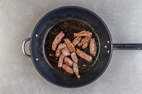 Das Fleisch trocken tupfen und in einer großen Pfanne oder einem Wok mit 2EL Pflanzenöl bei starker Hitze 2–3Min. scharf anbraten und mit 1TL Salz würzen.