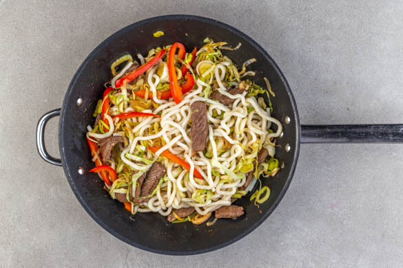 Die Nudeln untermengen und 2–3Min. mitbraten, ggf. teelöffelweise Öl zugeben.