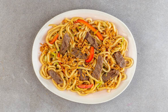 Die Rindfleisch-Udon mit den Röstzwiebeln garniert servieren.