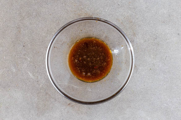 2EL Olivenöl, 4EL Balsamicoessig, 2EL Wasser, ½TL Salz und 1 kräftige Prise Pfeffer zu einem Dressing verrühren. Den ausgetretenen Fleischsaft aus der Pfanne unterrühren.