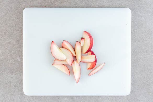 Die Nektarinen halbieren und entsteinen, dann das Fruchtfleisch in 1–2cm breite Spalten schneiden.