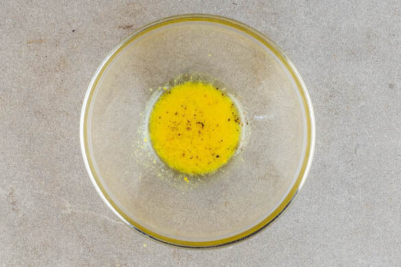 Die Zitronenschale abreiben, dann die Zitronen halbieren und auspressen. 1EL Zitronensaft mit 1EL Olivenöl und 2TL Senf zu einem Dressing verrühren. Mit Salz, Pfeffer und mehr Zitronensaft nach Geschmack würzen.