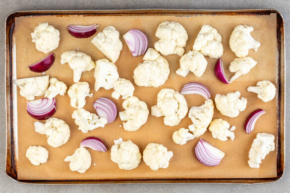 Den Backofen auf 240°C (220°C Umluft) vorheizen. Den Blumenkohl in mundgerechte Röschen zerteilen. Die Zwiebel schälen, halbieren und in ca. 1cm breite Spalten schneiden. Den Blumenkohl und die Zwiebeln auf einem mit Backpapier ausgelegten Backblech verteilen.