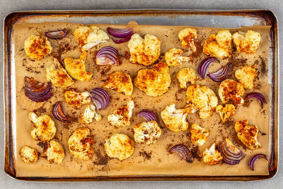 Den Blumenkohl und die Zwiebeln mit 2EL Olivenöl und je 1 Prise Salz und Pfeffer würzen und ca. 15Min. im Backofen backen, dann mit der Gewürzmischung vermengen und weitere 5–10Min. backen, bis der Blumenkohl gar und leicht gebräunt ist.