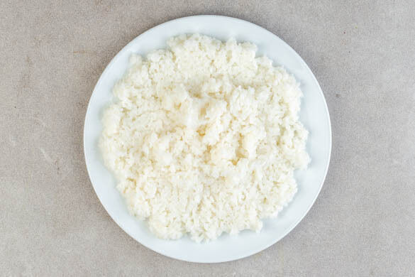 Den Reis in einem Sieb kalt abspülen, bis das Wasser klar bleibt. Sobald das Wasser kocht, den Reis hineingeben und abgedeckt bei niedrigster Hitze 18–20Min. kochen, bis das Wasser aufgesogen und der Reis gar ist. Noch ca. 5Min. ohne Hitzezufuhr ziehen lassen. 2TL hellen Essig und ½TL Zucker einrühren, auf einem großen Teller ausbreiten und in den Kühlschrank stellen.