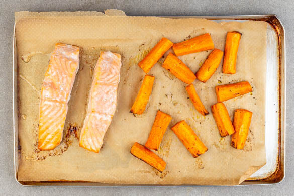 Mit einem scharfen Messer die Haut vom Fisch entfernen. Den Fisch trocken tupfen, evtl. vorhandene Gräten entfernen und mit 1EL Pflanzenöl beträufeln. Wenn die Karotten ca. 10Min. gebacken haben, den Fisch ebenfalls auf das Blech legen und 13–15Min. weiterbacken, bis die Karotten weich sind und der Fisch gar ist.