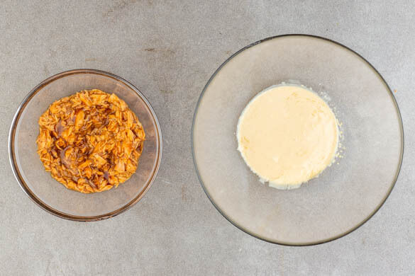 Inzwischen den Ingwer schälen und fein reiben. 4EL Mayonnaise, 1-2TL Ingwer, das Sesamöl, 2TL Sojasauce, 1TL Honig und 2EL hellen Essig zu einem Dressing verrühren. Abschmecken und ggf. nachwürzen. Den Fisch mit der Teriyakisauce vermengen und mit einer Gabel in kleine Stücke zerteilen.
