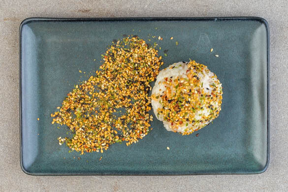 Die Gewürzmischung auf einen flachen Teller geben. In einer Schüssel etwas kaltes Wasser bereitstellen. Jeweils eine Handvoll Reis mit angefeuchteten Händen glatt drücken. Ca. 1EL Fisch in die Mitte des Reises geben, dann die Hand zusammenfalten, um den Fisch mit dem Reis zu umhüllen. Bei Bedarf etwas mehr Reis verwenden, um die Hülle zu schließen.