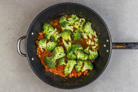 Den Knoblauch mit 2TL Olivenöl in derselben Pfanne bei niedriger Hitze ca. 1–2Min. anbraten. Die Tomaten zugeben und ca. 2Min. mitbraten. Die Gewürzmischung zugeben und 1Min. mitbraten. Das Brühgewürz, den Brokkoli und 300ml Wasser einrühren, bei mittlerer Hitze aufkochen und abgedeckt 5–10Min. sanft köcheln lassen, bis der Brokkoli bissfest ist.