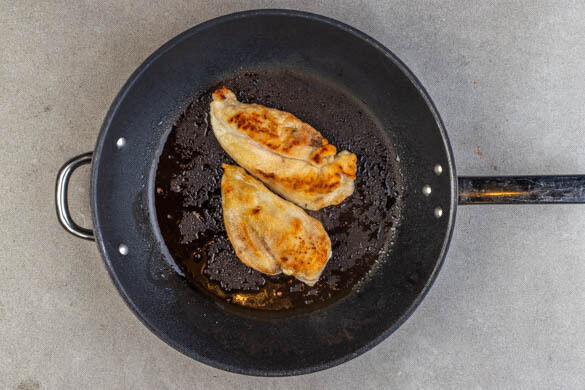 Das Fleisch trocken tupfen und von beiden Seiten mit je 1 Prise Salz und Pfeffer würzen. Das Fleisch in 4EL Mehl wenden und mit 2EL Olivenöl in einer großen Pfanne bei mittlerer bis starker Hitze auf jeder Seite in 2–3Min. goldbraun und knusprig braten. Aus der Pfanne nehmen und abgedeckt beiseitestellen. Die Pfanne wird weiterverwendet