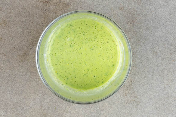 In einem kleinen Topf ausreichend Wasser für die Eier zum Kochen bringen. Die Eier in das kochende Wasser geben und bei mittlerer Hitze in 6–7Min. weich kochen. Die Eier kalt abschrecken und schälen. Das Kräuteröl, den Joghurt, die Zitronenschale, den Zitronensaft und die ½ des Käses mit je 1 kräftigen Prise Salz und Pfeffer in einem hohen Gefäß pürieren.