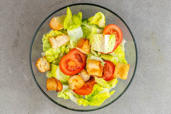 Den Salat vom Strunk befreien und in ca. 2cm breite Streifen schneiden. Mit den Croûtons, den Tomaten und ca. ⅓ des Dressings vermengen und mit je 1 Prise Salz und Pfeffer würzen.