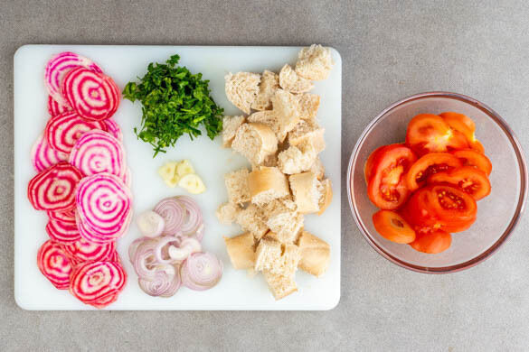 Den Ofen auf 240°C (220°C Umluft) vorheizen. Die Brötchen grob würfeln. Die Beten schälen und in dünne Scheiben schneiden. Die Tomaten in dünne Spalten schneiden und mit je 1 kräftigen Prise Salz, Pfeffer und Zucker vermengen. Den Schnittlauch und die Petersilie samt Stängeln grob schneiden. Die Schalotte und den Knoblauch schälen und in feine Scheiben schneiden.