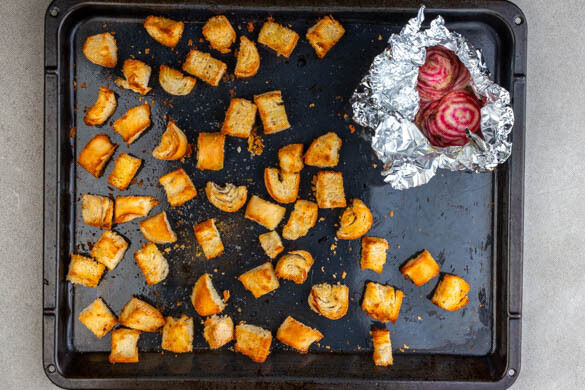 Die Brötchenwürfel auf einem Backblech mit 2EL Olivenöl und je 1 kräftigen Prise Salz und Pfeffer vermengen. Die Betescheiben mit 2EL Olivenöl und je 1 kräftigen Prise Salz und Pfeffer vermengen und in Alufolie einwickeln. Die Brötchenwürfel und die Beten 7–10Min. im Ofen backen, bis die Croûtons goldbraun und knusprig und die Betescheiben zart sind.
