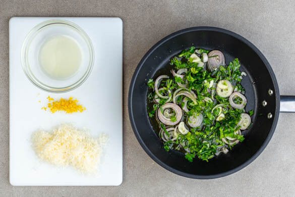 4EL Olivenöl in einer kleinen Pfanne bei hoher Hitze sehr stark erwärmen, dann vom Herd nehmen und 1–2Min. abkühlen lassen. Ca. 2EL der Kräuter für die Garnitur aufbewahren. Die übrigen Kräuter mit den Schalotten und dem Knoblauch in das heiße Öl rühren. Die Zitronenschale abreiben, dann die Zitrone halbieren und auspressen. Den Käse fein reiben.