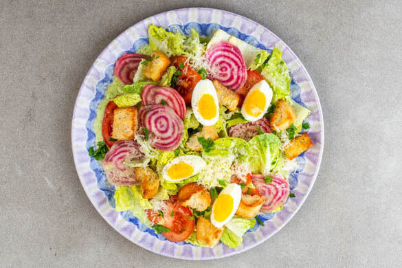 Ein vegetarischer De-luxe-Salat erwartet dich hier, schön bunt und voller Raffinesse: Die krossen Croûtons, feine Chioggia-Bete und wachsweich gekochtes Ei machen sich richtig gut auf dem Bett aus knackigem Romana und fruchtigen Tomaten. Den großen Auftritt heute hat aber das sattgrüne Dressing aus Schnittlauch, Petersilie, Zitrone und Joghurt. Einfach göttlich!