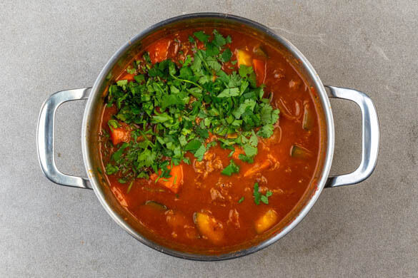 Den Eintopf vom Herd nehmen und 1½EL Essig und die ½ des Korianders unterrühren. Den Eintopf etwas abkühlen lassen und ggf. mit mehr Pfeffer nachwürzen. Den Eintopf auf dem Reis anrichten und mit dem restlichen Koriander garniert servieren.