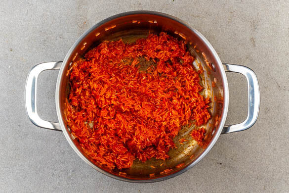 Den Reis, das Tomatenmark und die ½ der Gewürzmischung in einem kleinen Topf mit 1EL Pflanzenöl und je 1 kräftigen Prise Salz und Pfeffer bei mittlerer Hitze 1–3Min. anbraten, bis der Reis leicht glasig und das Tomatenmark dunkelrot wird.
