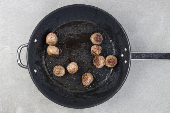Die fertig gebratenen Hackbällchen aus der Pfanne nehmen, dann die passierten Tomaten in die Pfanne geben und mit 1 Prise Zucker, dem restlichen Knoblauch und der restlichen Gewürzmischung abschmecken. Das Basilikum mit Stängeln unterrühren. Die Hackbällchen dazugeben und 4–5Min. in der Sauce mitköcheln lassen. Nach Wunsch mit Salz und Pfeffer nachwürzen.
