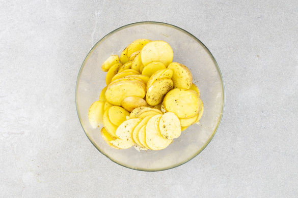 Den Backofen auf 240°C (220°C Umluft) vorheizen. Die Kartoffeln samt Schale in ca. 0,5cm dünne Scheiben schneiden. Mit 1EL Olivenöl, ca. 1EL Gewürzmischung und 1 Prise Salz vermengen.