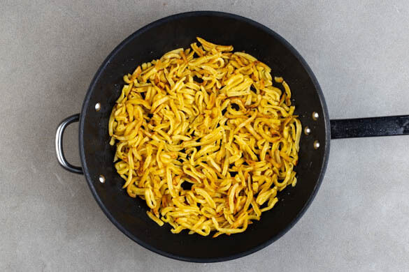 Die Spätzle in der Pfanne mit dem Bratenfett mit 1 Prise Salz bei mittlerer bis starker Hitze 4–5Min. braten, bis sie goldbraun und gar sind, dabei gelegentlich umrühren. Tipp: Wenn beim Braten des Bacons nicht viel Fett ausgetreten ist, kannst du noch 1EL Olivenöl dazugeben.