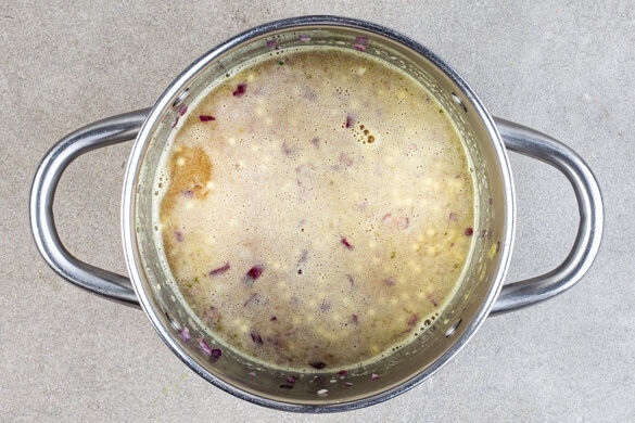 Den Perlencouscous zu den Zwiebeln geben und ca. 1Min. unter Rühren mitbraten. Mit der Brühe ablöschen, dann aufkochen lassen und den Perlencouscous abgedeckt bei mittlerer Hitze 8–10Min. sanft köcheln lassen, bis die Brühe aufgesaugt und der Perlencouscous gar ist.