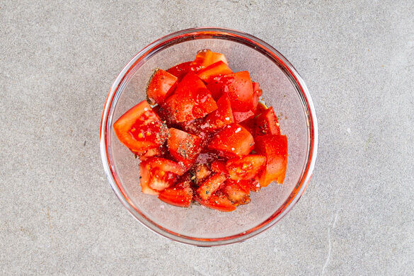 Die Tomaten in ca. 2cm große Würfel schneiden und mit der Sriracha-Sauce, 1EL hellem Essig sowie je 1 Prise Salz und Pfeffer vermengen. Tipp: Wenn Kinder mitessen, die Sriracha-Sauce ggf. weglassen und nur die eigene Portion zum Servieren verfeinern.