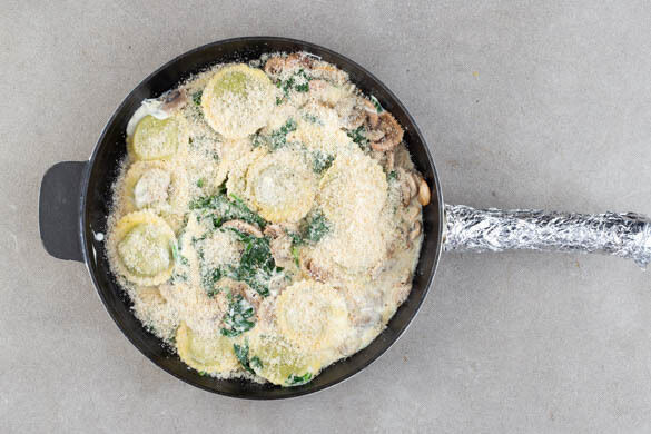Die Käse-Brösel-Mischung gleichmäßig auf der Pasta verteilen und die Tortelli im Ofen in 3–5Min. goldbraun überbacken. Auf Teller verteilen und servieren.