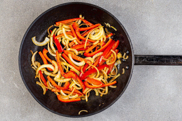 Die Zwiebel schälen, halbieren und in feine Streifen schneiden. Die Paprika vierteln, entkernen und ebenfalls in feine Streifen schneiden. Die Zwiebeln und die Paprika in einer zweiten mittelgroßen Pfanne mit 1EL Olivenöl sowie 1/2TL Salz und 1 Prise Pfeffer bei mittlerer Hitze 10–12Min. anbraten. Gelegentlich umrühren.