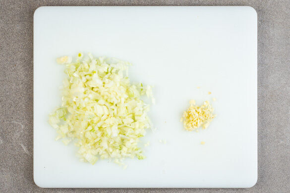 Den Backofen auf 220°C (200°C Umluft) vorheizen. Den Teig bis zur Verwendung im Kühlschrank aufbewahren. Die Zwiebel schälen, halbieren und in möglichst kleine Würfel schneiden. Den Knoblauch schälen und ebenfalls fein würfeln.