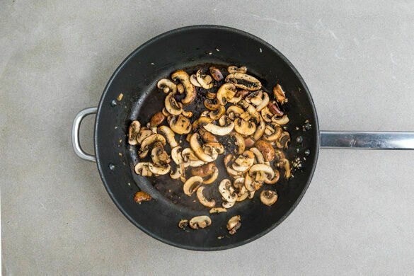 Die Pilze mit der Sojasauce ablöschen und weitere 1–2Min. braten, bis die Flüssigkeit verdampft ist.