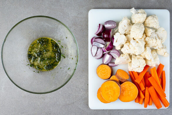 Die ½ des Oregano mit 1EL Olivenöl und je 1 Prise Salz und Pfeffer verrühren. Die Zwiebel schälen, halbieren und in ca. 2cm dicke Spalten schneiden. Die Süßkartoffel samt Schale in ca. 1cm dicke Scheiben schneiden. Die Karotten ggf. schälen und längs in etwa fingerdicke Stifte schneiden. Den Blumenkohl in Röschen schneiden.