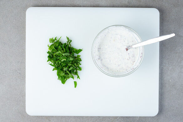 Den Knoblauch mit einer Gabel zerdrücken und mit dem Joghurt verrühren. Den Dip nach Geschmack mit Salz, Pfeffer und Sumach würzen. Die Petersilienblätter abzupfen und grob schneiden. Das Fleisch und das Gemüse auf Teller verteilen und mit dem Dip anrichten. Mit der Petersilie, dem restlichen Oregano und etwas Sumach garniert servieren.