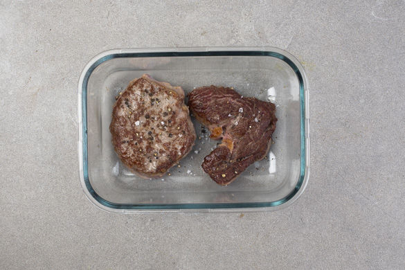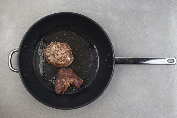 Die Steaks aus der Pfanne nehmen und in eine Auflaufform geben, die Pfanne beiseitestellen. Das Fleisch mit Salz und Pfeffer würzen und im Ofen 5–7Min. garen, sodass es in der Mitte noch rosa ist. Die Garzeit kann abhängig von der Dicke des Fleisches variieren.