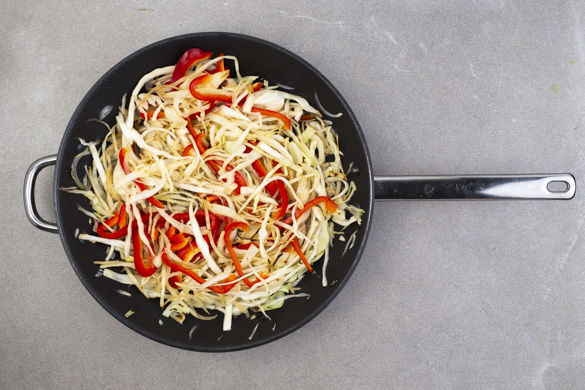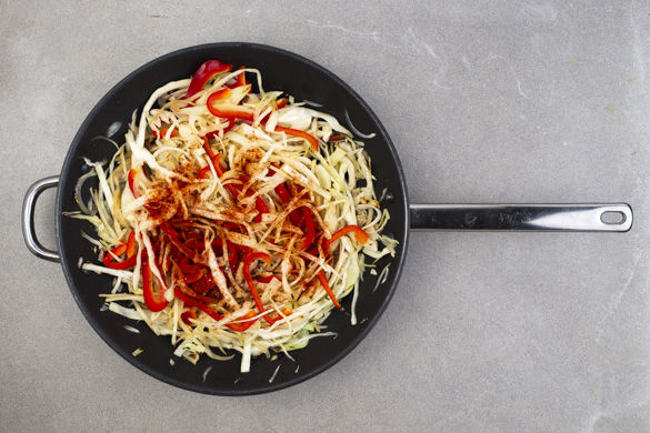 Den Weißkohl in derselben Pfanne mit 2–3EL Olivenöl bei mittlerer Hitze 3–4Min. anbraten. Die Paprika, die Zwiebeln und den Knoblauch dazugeben und 2–3Min. mitbraten.