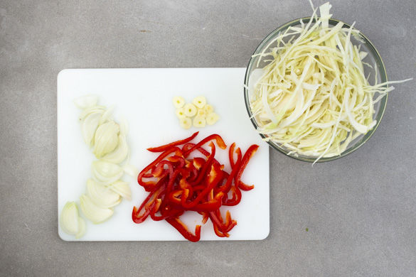 Den Backofen auf 180°C Umluft (200°C Ober-/Unterhitze) vorheizen. Den Weißkohl ggf. verlesen. Die Paprika vierteln, entkernen und in dünne Streifen schneiden. Die Zwiebel schälen, halbieren und ebenfalls in dünne Streifen schneiden. Den Knoblauch schälen und in feine Scheibchen schneiden.