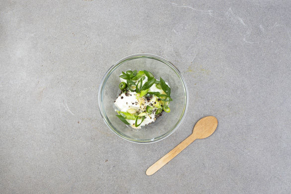 Die Lauchzwiebeln in feine Ringe schneiden und mit der sauren Sahne verrühren. Den Dip mit Salz und Pfeffer abschmecken.