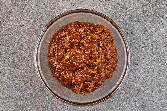 Den Backofen mit Grillfunktion oder Ober-/Unterhitze auf 250°C vorheizen. Den Knoblauch schälen und fein würfeln. Die Erdnussbutter mit der Sweet-Chili-Sauce, der Sojasauce und der ½ des Currypulvers glatt rühren, dann den Knoblauch und 2–3EL Wasser unterrühren.