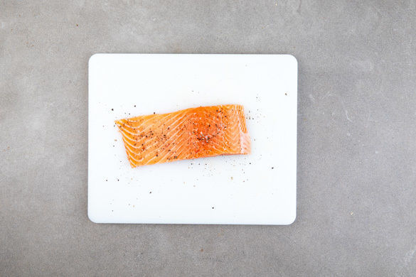 Den Lachs mit etwas Küchenkrepp trocken tupfen und von beiden Seiten mit Salz und Pfeffer würzen. Evtl. vorhandene Gräten mit einer Pinzette entfernen.