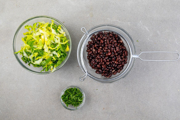 Den Romanasalat in dünne Streifen schneiden. Den Koriander samt Stängeln fein schneiden. Die Bohnen in ein Sieb abgießen, kurz abspülen und abtropfen lassen.