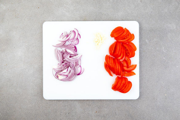 Die Tomaten vierteln, vom Kerngehäuse befreien und in feine Streifen schneiden. Die Zwiebel schälen, halbieren und in dünne Streifen schneiden. Den Knoblauch schälen und fein würfeln.