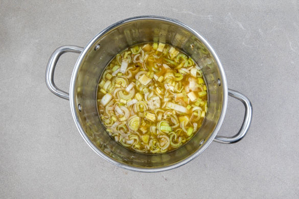 Den Knoblauch schälen und in feine Scheibchen schneiden. Den Lauch in einem mittelgroßen Topf mit 1EL Olivenöl bei mittlerer Hitze ca. 2Min. andünsten. Mit 2–3EL Mehl bestäuben und verrühren, dann mit 200ml Wasser ablöschen und den Brühwürfel darin auflösen.