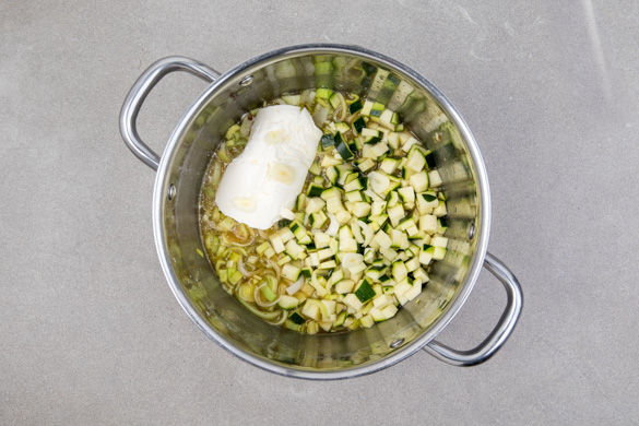 Die Zucchini und den Knoblauch in den Topf geben und alles 3–4Min. sanft köcheln. Den Schmand unterrühren, aber nicht mehr aufkochen lassen.