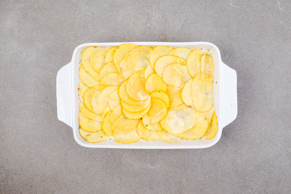 Die Gemüse-Fisch-Mischung in eine große Auflaufform geben und die Kartoffelscheiben überlappend darauf verteilen. Tipp: Sollte die Mischung sehr dünnflüssig sein, einfach etwas Flüssigkeit abschöpfen. Die Kartoffelhaube mit 1EL Olivenöl beträufeln und den Auflauf ca. 15Min. im Ofen goldgelb und knusprig überbacken.