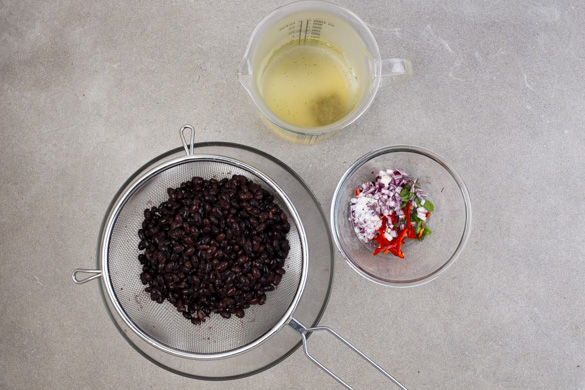 Den Backofen auf 180°C Umluft (200°C Ober-/Unterhitze) vorheizen. Die Limettenschale abreiben, dann die Limetten auspressen. Den Limettenabrieb und 3/4 des -saftes mit den restlichen Zwiebeln, dem gehackten Koriander, den Chilistreifen und 1 Prise Salz zu einer Salsa verrühren. Die Bohnen in ein Sieb abgießen. Die Brühwürfel in 800ml heißem Wasser auflösen.