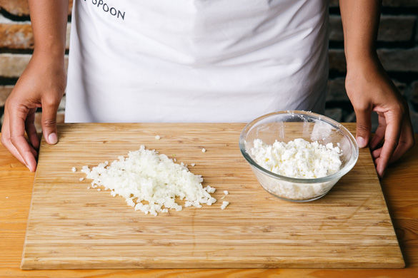 Den Backofen auf 180°C Umluft (200°C Ober-/Unterhitze) vorheizen. Die Zwiebel schälen und in möglichst feine Würfel schneiden. Den Käse mit den Fingern oder einer Gabel zerkrümeln.
